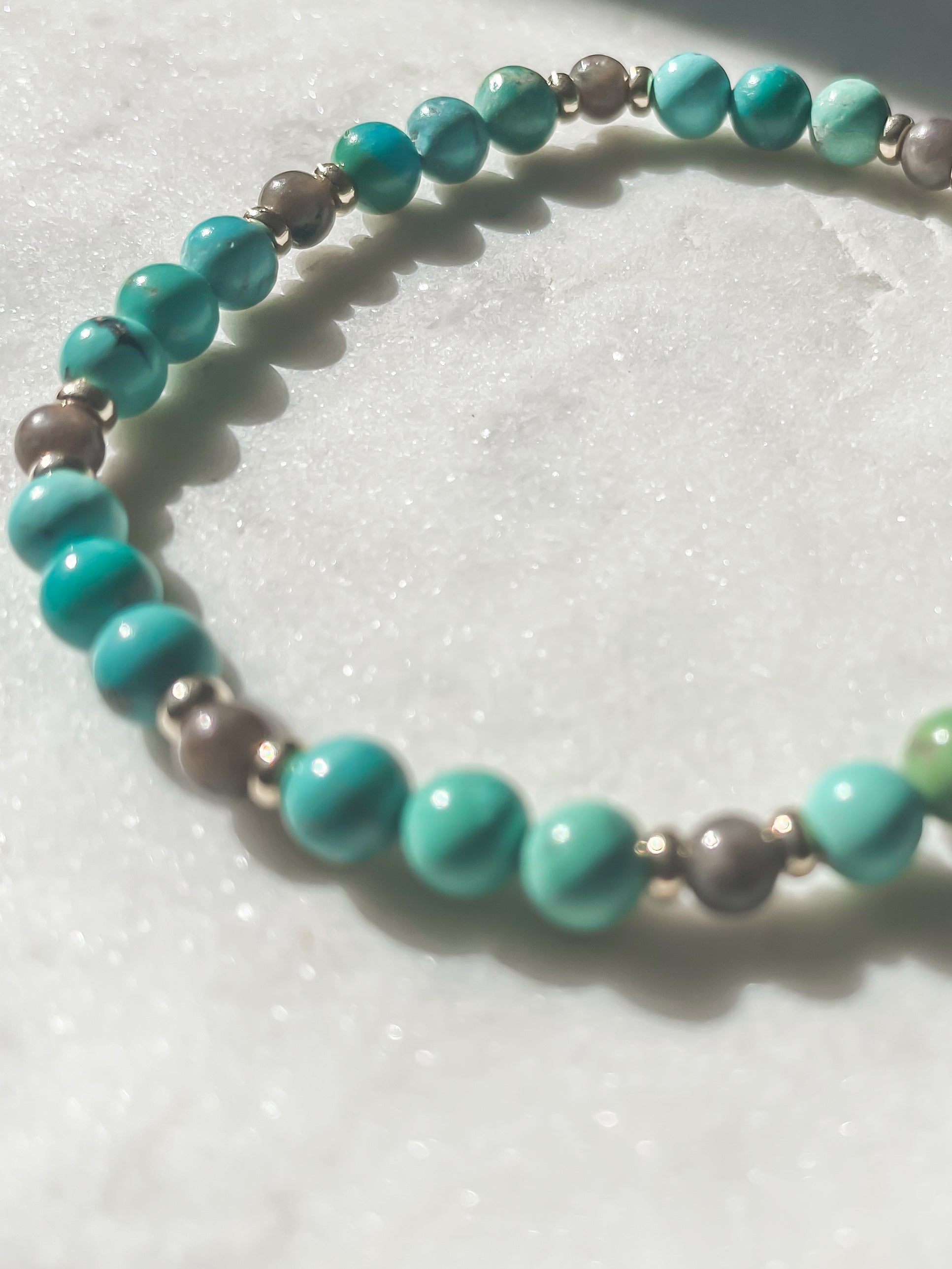 The Sea & Stone Bracelet is a meaningful balance of flow and foundation. Turquoise, a stone of communication, serenity, and protection, pairs effortlessly with chocolate labradorite, known for its ability to support transformation, calm, and inner clarity.