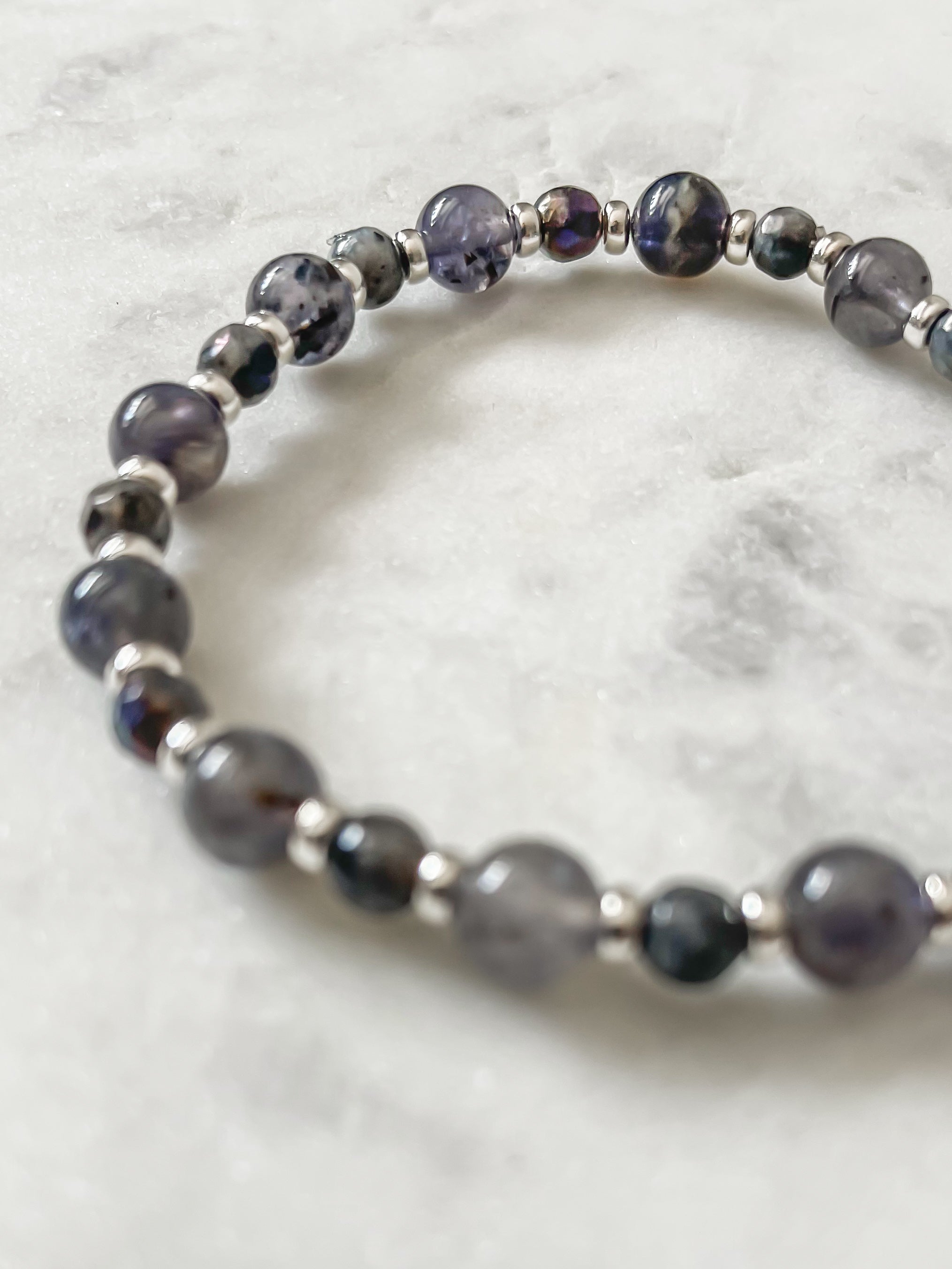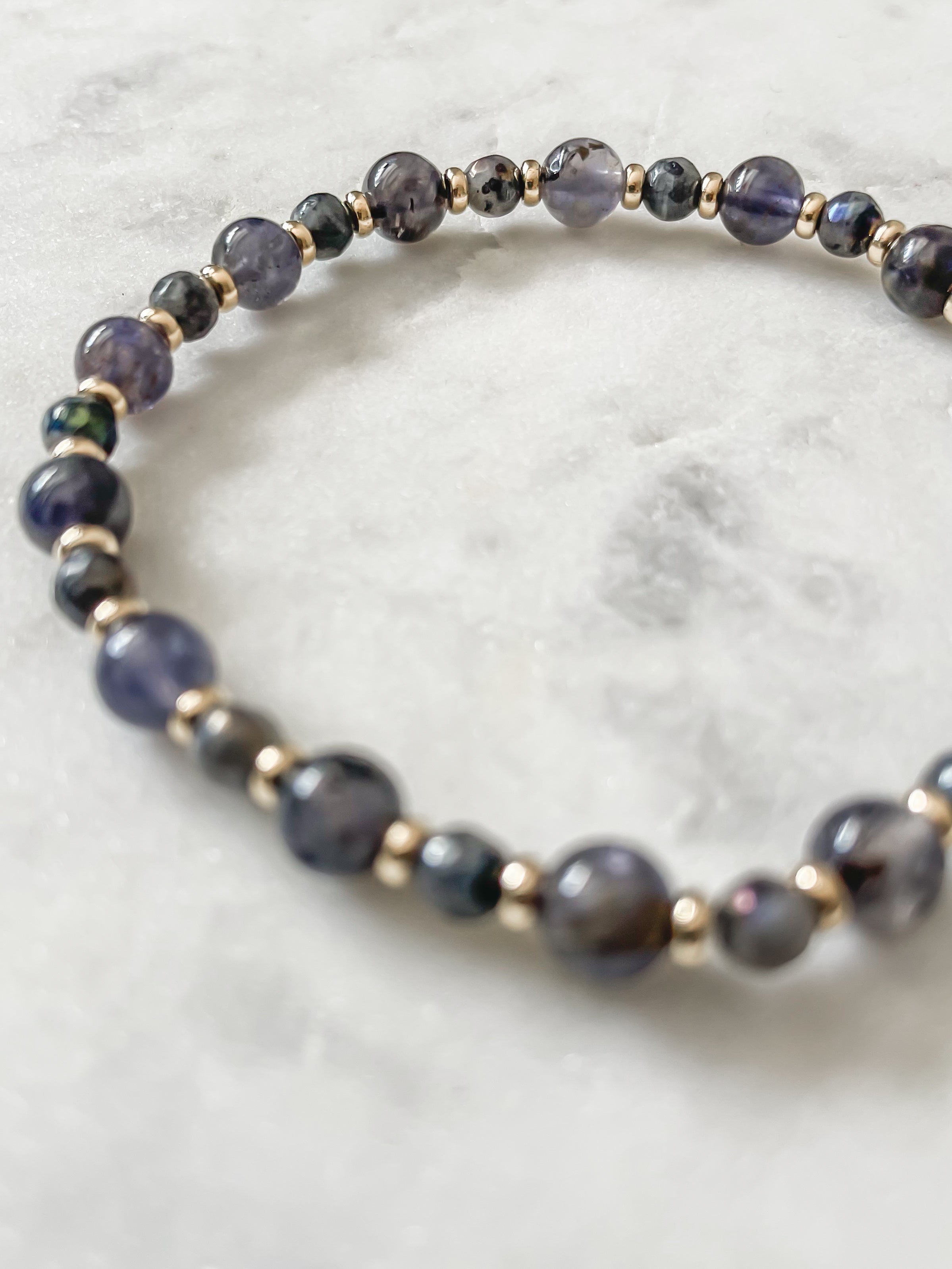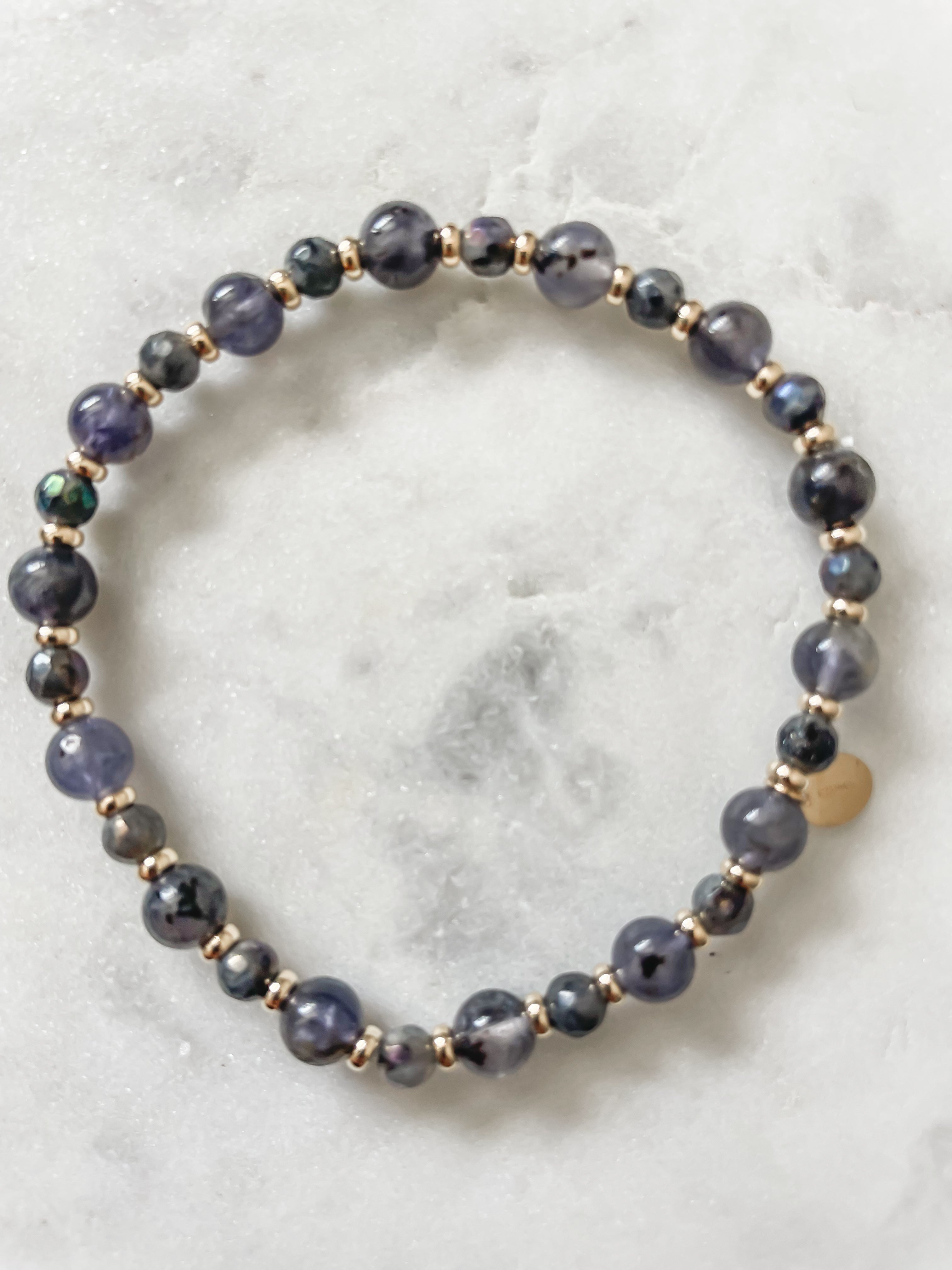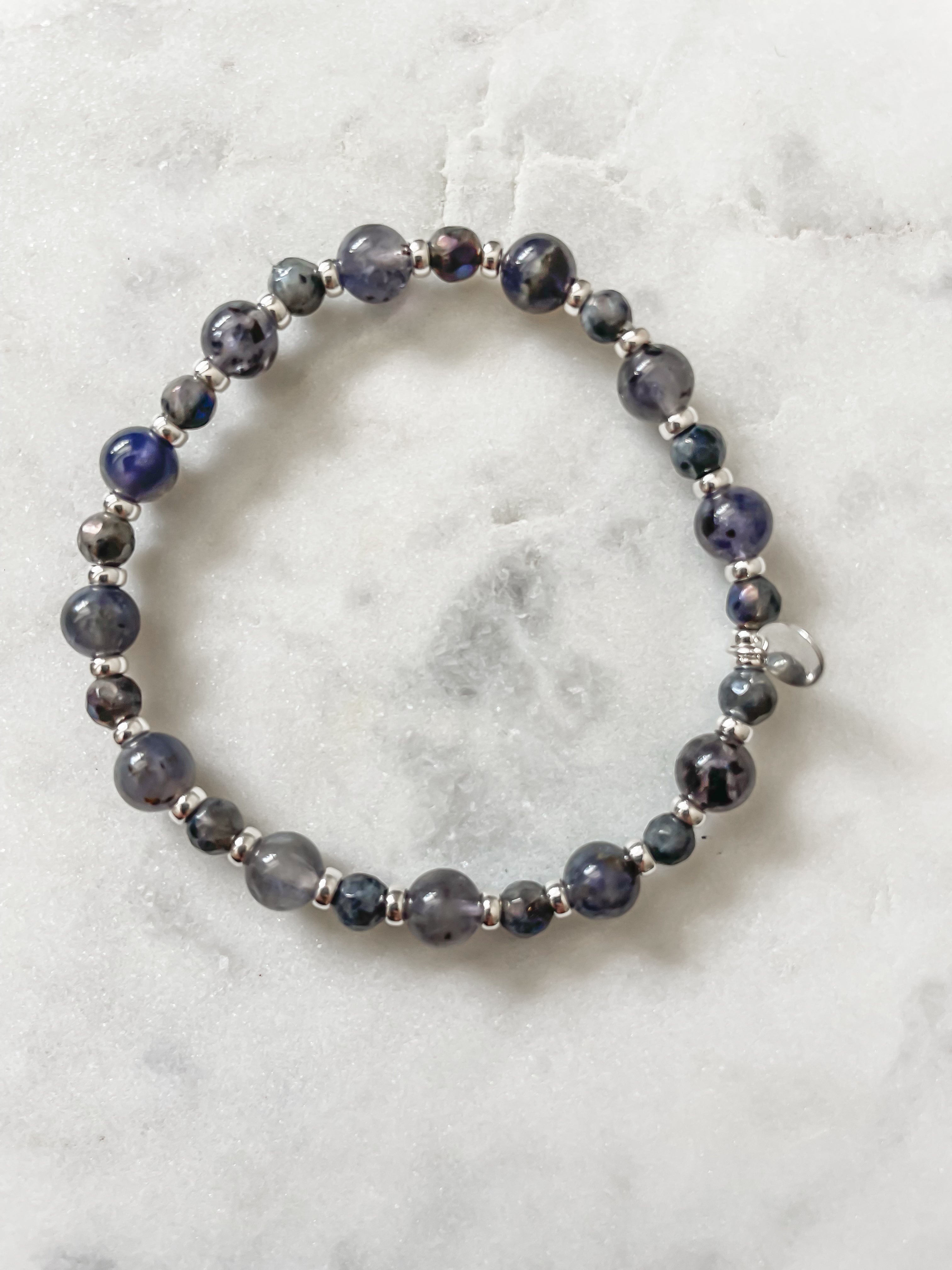 Let Starry Night be your guide through the unknown. This soulful bracelet pairs iolite—the stone of inner strength and self-trust—with labradorite, a stone of calm, change, and transformation. Together, they echo the energy of a night sky: quiet, vast, and full of possibility.