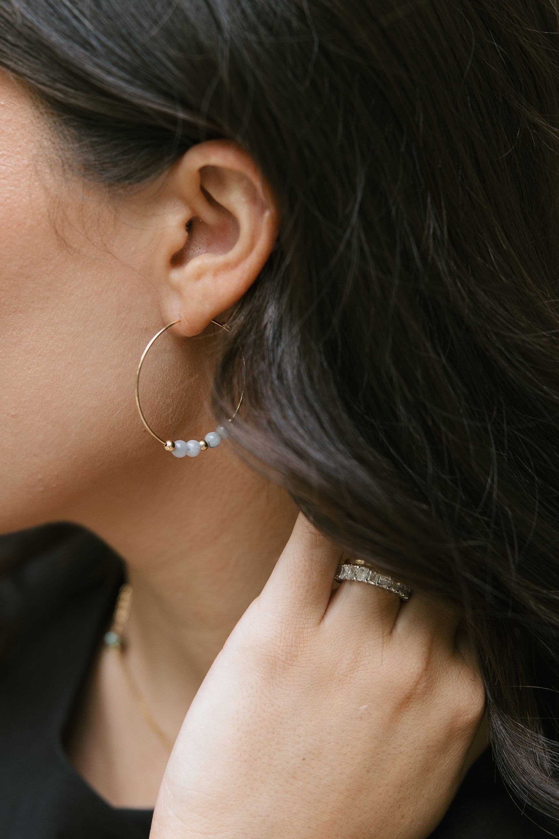 Meet the Storm Haze Hoops. A soft, moody wash of blue-grey inspired by the palette behind our Stormlight Bracelet. These gold-filled or sterling silver hoops are accented with a bluish-grey jade gemstone, offering a calm, grounded glow that feels refined and subtly eye-catching.