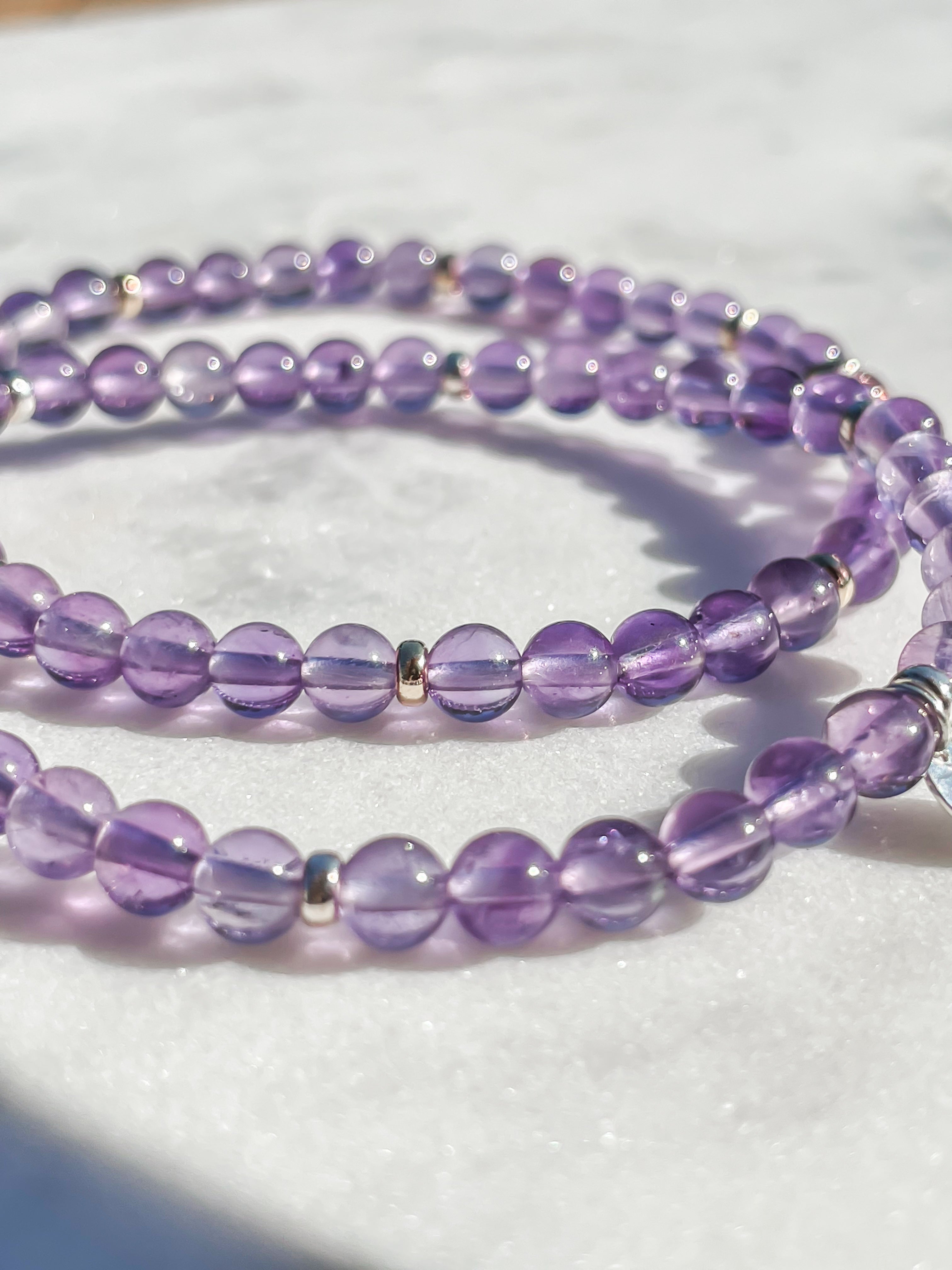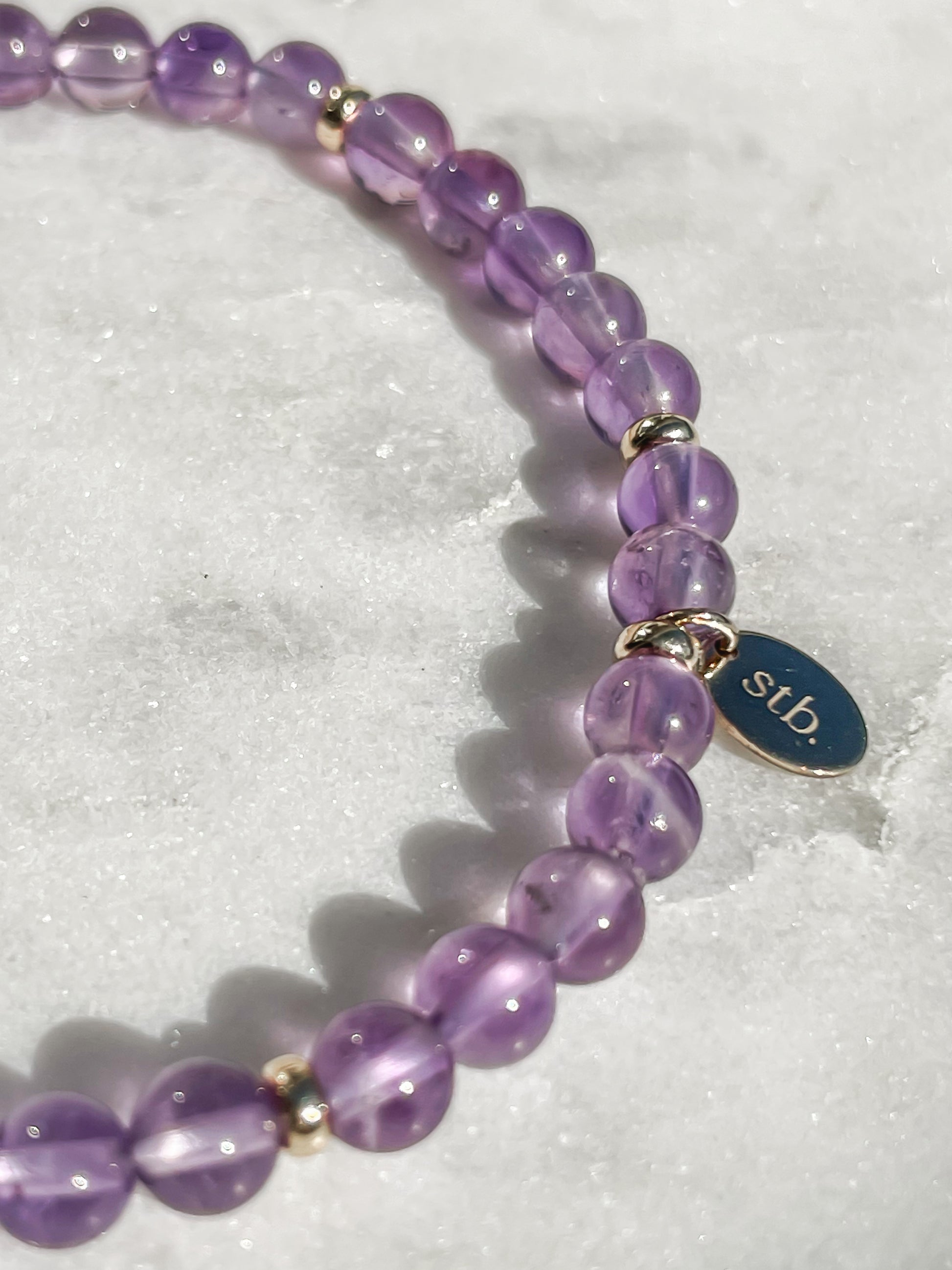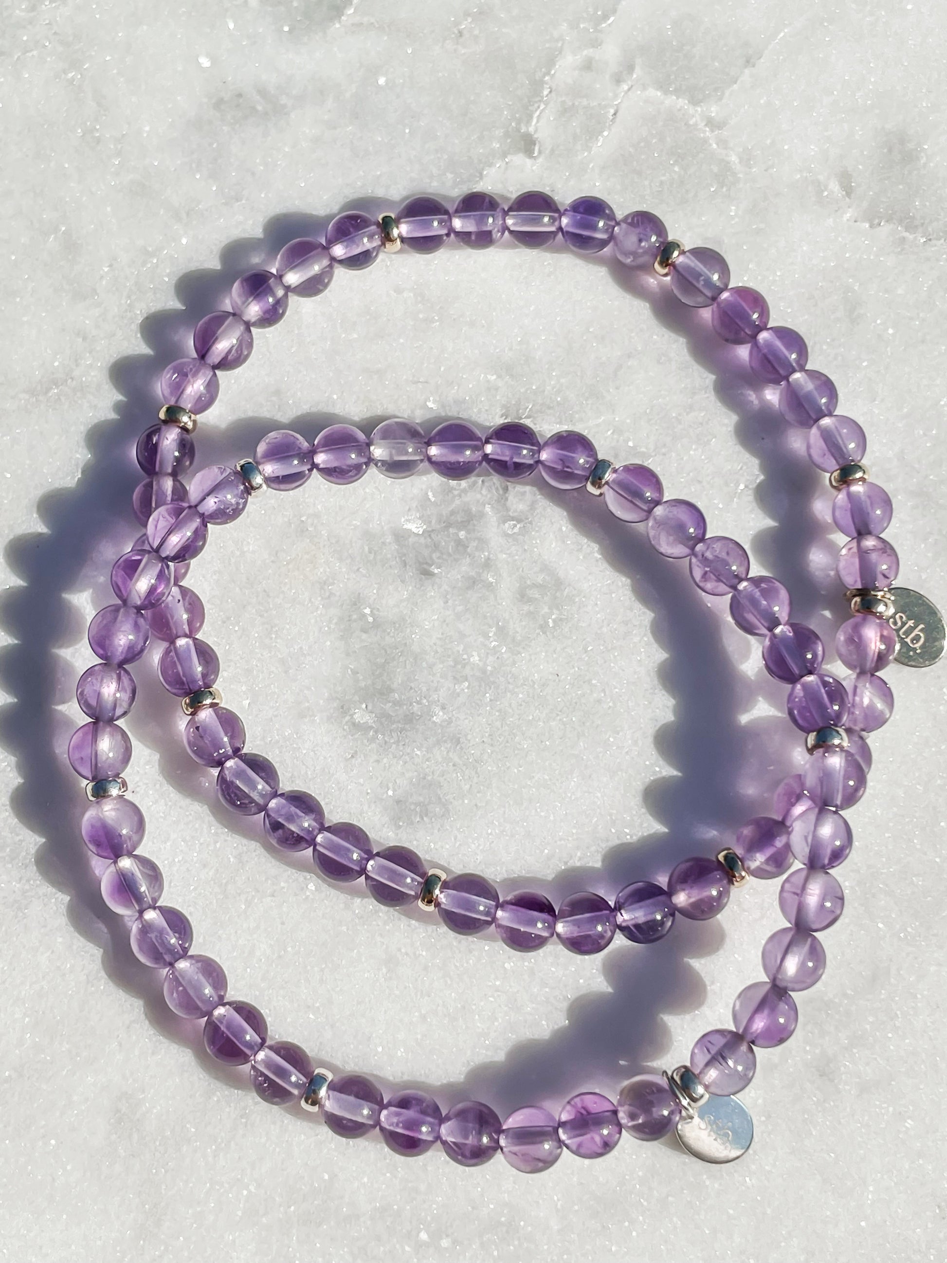 The Alissa (named after one of our OG clients) is made with the most beautiful shade of amethyst stones I have seen. The clarity is stunning and and we just love the simplicity this bracelet brings with the gold or silver accents.