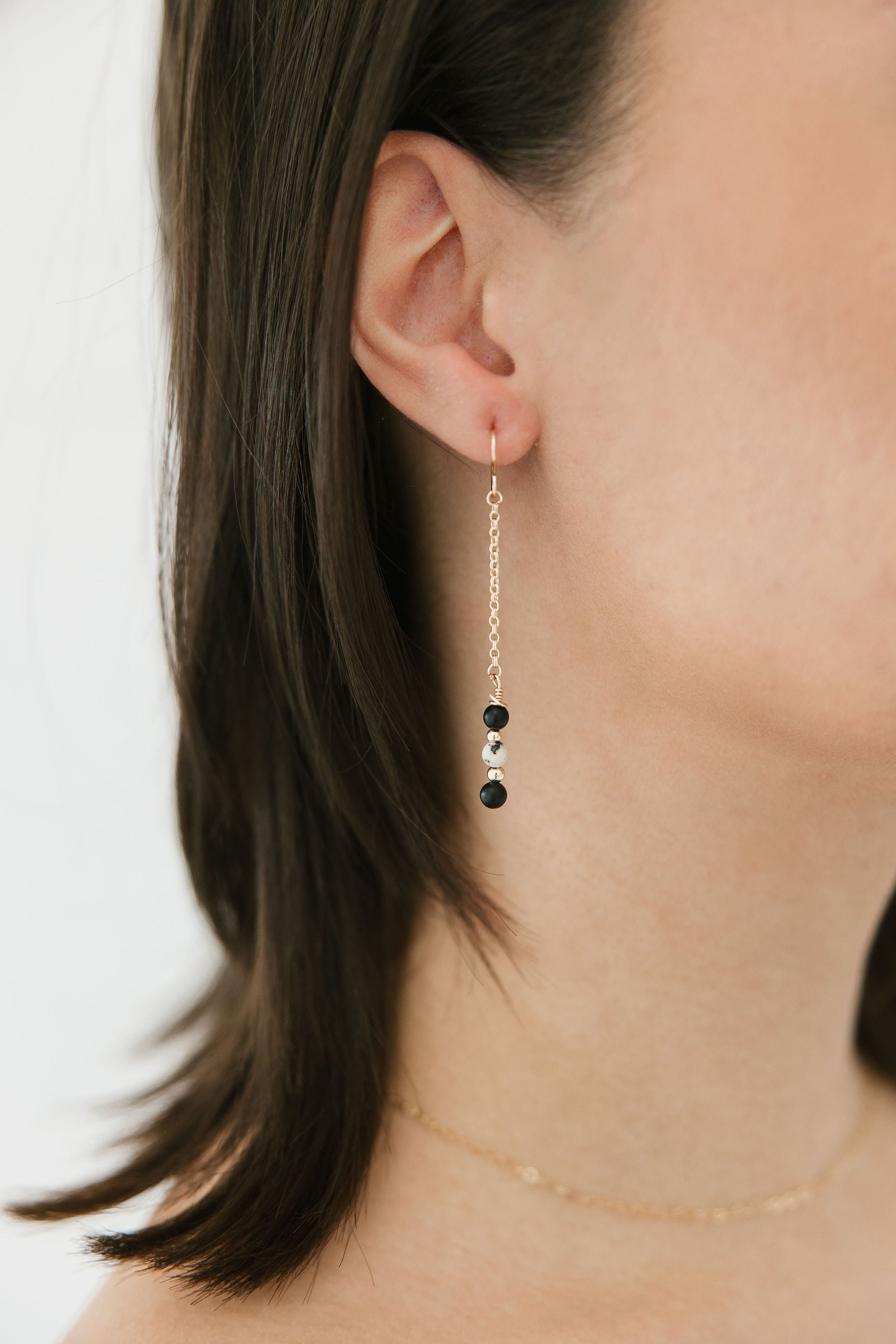 Introducing The Rooted Drops—chain drop earrings designed to ground and uplift, all at once. Featuring a delicate double-link chain in your choice of 14k gold filled or sterling silver, each pair is finished with a trio of mini gemstone beads: protective black onyx and joy-bringing dalmatian jasper.