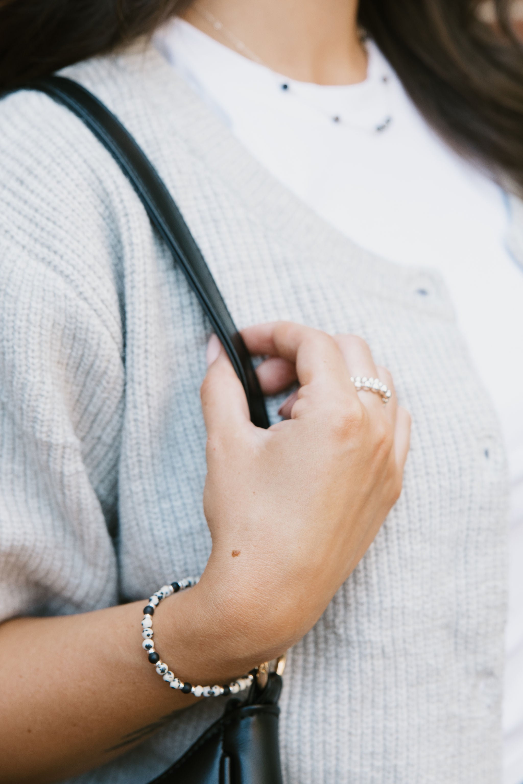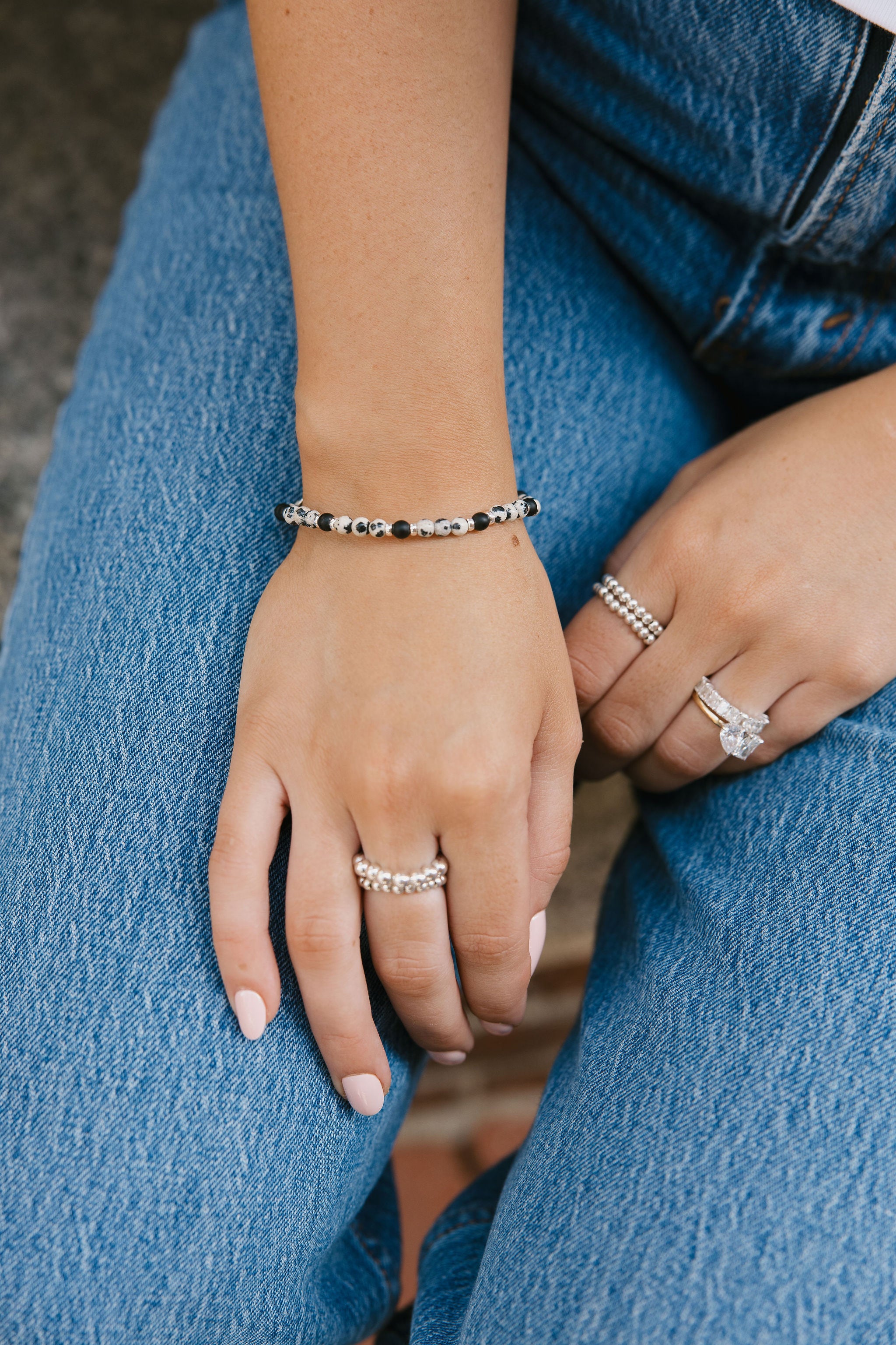 The Rooted Spots Bracelet is a grounded little moment of balance. Pairing Dalmatian Jasper for joy and clarity with Black Onyx for strength and protection. Each stone is intentionally placed to bring a steady, earthy energy to your stack, with just the right amount of contrast.